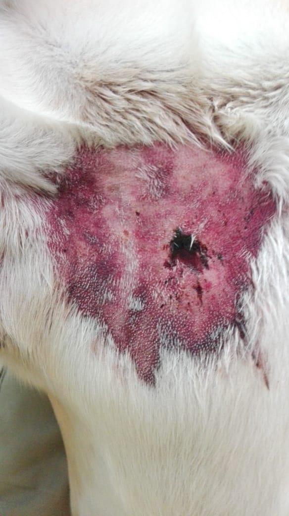 As you will see when looking at the photos taken at intervals during the treatment of this particular dog, Photo 1 taken soon after the dog was bitten, shows deep discolouration around the site of the wound.