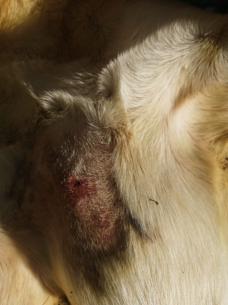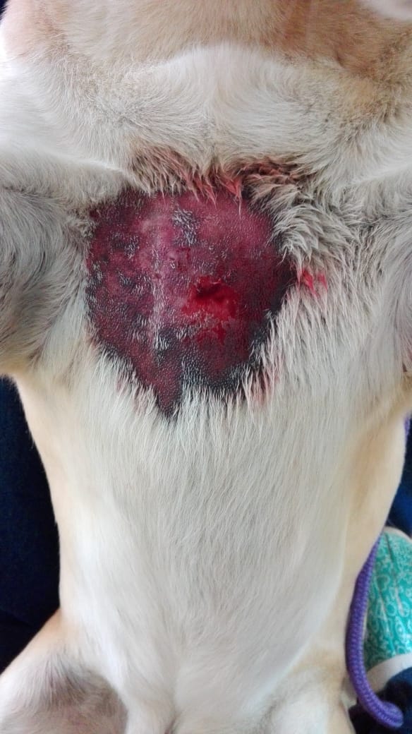 As you will see when looking at the photos taken at intervals during the treatment of this particular dog, Photo 1 taken soon after the dog was bitten, shows deep discolouration around the site of the wound.